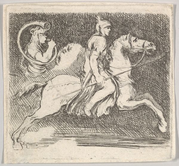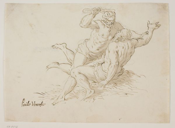 Editor: Here we have Nicolai Abildgaard's "Scene af Apulejus' 'Det gyldne æsel' 10.bog. Den fornemme dame opmuntrer æslet," created between 1808 and 1809. It's an ink drawing on paper. The scene feels so dynamic, almost theatrical. I'm curious, what do you see when you look at the structure of this piece? Curator: The lines are quite deliberate. Notice how Abildgaard uses line weight to create depth, even though the color palette is restricted. It's an interesting dance between representation and the abstract quality inherent to drawing itself. Have you observed how the draping of the clothing emphasizes the form beneath it? Editor: Yes! The fabric folds seem to cling and accentuate the body's posture. It makes me think of classical sculpture. Curator: Precisely. There's a deliberate echoing of classical sculpture here. He also used layering to generate transparency; where do you see use of that technique? Editor: That's evident in how the donkey appears—it seems as if some part of it is about to dissolve! Its positioning adds an interesting element. What is the role of its legs to your eye? Curator: The legs create movement. Note how Abildgaard contrasts the more solid front legs with the ghostly, implied legs towards the rear. This contrast serves to highlight the dynamic tension within the composition, wouldn’t you agree? Editor: Absolutely. It creates an energy, despite the limited palette. It is exciting. I never would have analyzed the weight of the lines independently. It makes the image's structure stronger than I would have thought! Curator: It’s by deconstructing the artwork into its basic structural elements that one may appreciate the artist's full genius and intended narrative.