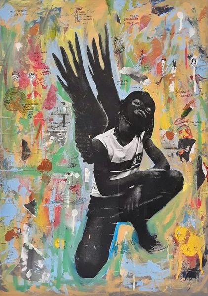 Alberto Pereira created this artwork entitled ‘Akin’ which depicts a young boy with wings playing the violin, pasted onto an exterior yellow wall. The wall is distressed with graffiti, suggesting the artwork has been placed in an impoverished or marginalized community. The image creates meaning through visual codes, cultural references, and historical associations. The winged figure can be read as an angel, symbolizing hope and freedom. The violin, often associated with European classical music, is here played by a young boy of color. Placed together, the artwork could reflect the artist's socio-political vision by combining symbols of elitist culture with the realities of life for children in Brazil today. The choice of a distressed exterior wall can also be seen as a progressive statement, critiquing the institutions of art by bringing the image directly to the people and engaging with the existing urban landscape. As historians, our interpretation of art is always contingent on social and institutional context. Further research into Brazilian socio-economic conditions, art movements, and the artist's biography would help us understand this work even better.