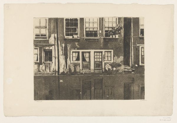 Editor: This is "Jodenhouttuinen" by Willem Witsen, dating from between 1875 and 1923. It's a print, housed here at the Rijksmuseum. The tonal range really strikes me. It's a somber, almost ghostly image of a street scene. What do you see in this piece? Curator: I see a powerful intersection of place and history, charged with social and political meaning. The “Jodenhouttuinen,” or Jewish Timber Gardens, suggests a location historically linked to Amsterdam's Jewish community. Knowing that, how does the somber mood you mentioned resonate now? Editor: It shifts my perspective. It's not just a pretty street; it feels like a memorial or a reminder of a community’s presence. Curator: Exactly. Witsen was part of the Amsterdam Impressionism movement, capturing everyday life. But consider: who's everyday life was being represented, and whose was being erased or marginalized? What do you notice about the perspective he’s chosen? Editor: It's a very still perspective. Empty even, giving me an isolating feeling. As if no one occupies the buildings any more. Curator: The emptiness in the image invites reflection on absence. Given the name, and the history of the Jewish community in Amsterdam, we must consider if it provides insights into larger socio-political contexts such as alienation. How do you view this artwork now? Editor: I now understand there is more to a city than what immediately meets the eye. Thank you! Curator: Absolutely! The interplay of place, history, and artistic interpretation really makes this artwork particularly evocative.