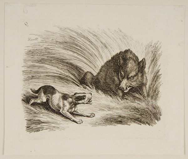 Curator: This is Joseph Fussell’s etching, "A Sow and Her Four Piglets," housed here at the Harvard Art Museums. Editor: It strikes me as quite idyllic, really. A tranquil pastoral scene rendered with delicate strokes. Curator: The sow and her piglets carry symbolic weight. Pigs, often linked to fertility and abundance, also connect to rural life and its grounding rhythms. Editor: Indeed. Fussell's mark-making captures textures beautifully. The hay, the bristly hair of the sow... it's all so carefully observed. Curator: These domestic scenes often served as moral allegories, reminding viewers of familial harmony and the natural order. The pig is a symbol of sustenance and familial devotion. Editor: It's interesting how the composition directs our eye. The sow acts as a visual anchor, while the piglets scatter across the space, creating movement. Curator: Yes, and the seemingly simple scene holds a certain universality—the nurturing mother, the dependent offspring. Editor: The artist’s attention to tonal contrast enhances the sense of depth and form. It really gives shape to the sow’s bulk. Curator: Seeing the work in person allows for a deeper connection to the artist's craft and the enduring themes it explores. Editor: Ultimately, it’s a beautiful example of how formal elements can evoke powerful cultural associations.
