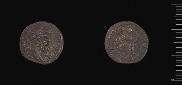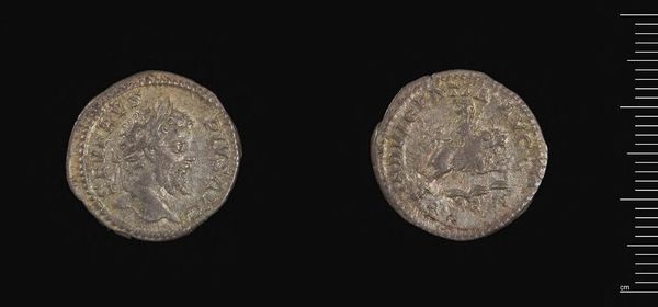 Curator: This is a denarius of Caracalla, currently held at the Harvard Art Museums. It’s quite small, less than 3 grams. What are your first thoughts? Editor: It feels incredibly weighty despite its size. I am immediately drawn to the stark profile of Caracalla; it has a somewhat haunting presence. Curator: The coin offers insight into Caracalla's reign, particularly the political image he cultivated. Coins were, in essence, mass media, projecting power and ideology throughout the Roman Empire. Editor: Absolutely. The image also conveys a carefully constructed persona of authority. It speaks volumes about the emperor’s self-perception and how he wanted to be seen. It touches on themes of power, image, and masculinity. Curator: It’s a fascinating glimpse into the intersection of art and politics in ancient Rome. Editor: Indeed, a tangible piece of history that sparks many questions about Roman society.