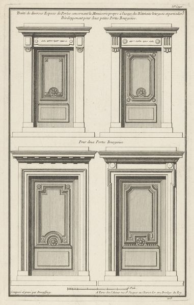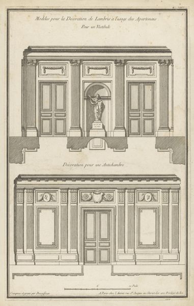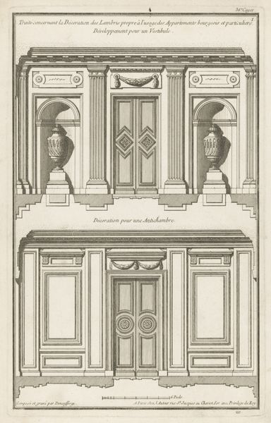 Curator: Take a look at this engraving from around 1760, titled "Deuren en wandtapijten," or "Doors and tapestries," by Jean François de Neufforge. It's a study in architectural design. What's your immediate impression? Editor: There's a formality, a precision here that I find quite cool and restrained. It almost feels more like an instruction manual than a finished artwork. The linear details feel really dominant and that lack of any organicism to it evokes control. Curator: Indeed. Neufforge was hugely influential, producing numerous books of architectural designs marketed to builders and patrons. Think about the craft and skill involved in engraving. Every line, every shadow had to be meticulously planned and executed. We're seeing not just design, but the labor of transferring that design into reproducible form. Editor: Right, the layers of labor: the initial design conception, the physical labor of engraving… it really grounds this image. Beyond the materiality of the engraving itself, I'm interested in what this tells us about interior spaces of the time. This design embodies class and social hierarchy—it implies wealth, permanence and control over both the aesthetics and functionality. The use of busts as decoration feels deliberate in implying a family history. Curator: Exactly. The inclusion of tapestries adds another layer. It isn't merely an aesthetic choice but a functional one: offering insulation but also indicating wealth due to their complex methods of production, displaying status. Think about the weaving workshops needed, the dyes sourced and applied... The patterns included, like landscapes or geometric figures, are incredibly diverse. Editor: And they function almost like proto-photographs, capturing scenes and ideas in fabric. What do these planned spaces mean for those who occupied them? How would a family living here engage with these prescribed decorations? Curator: I think that tension—between pre-designed spaces and the lives lived within them— is critical here. Were these plans liberating or constraining for residents? Editor: It's a push and pull of production—someone designed and fabricated all this decor that someone else purchased. Curator: A beautiful tension to end on. Thanks! Editor: Indeed, a dialogue etched in ink! Thank you.