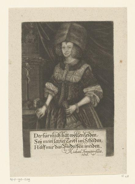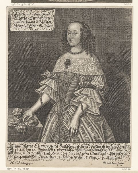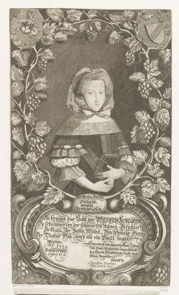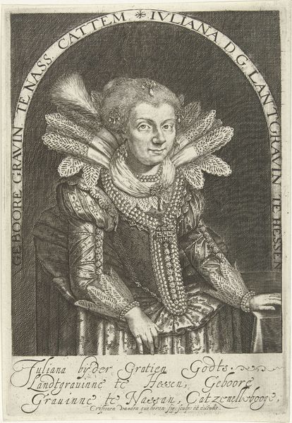 Curator: Here we have Crispijn de Passe the Elder's "Queen Elizabeth I," an engraving dating to 1592. The print gives such detailed rendering of her garment! Editor: It's certainly...regal. My initial impression is of rigid formality. The stark lines, the almost obsessive detail in the ruff and dress—it feels designed to project power, less so to capture personality. The geometric patterns create this formidable image. Curator: I see it as more than just an exercise in portraying power. Consider the social context of printmaking at the time. Engravings like these made Elizabeth’s image reproducible and widely accessible. The circulation of these images played a key role in constructing her persona as the 'Virgin Queen', the staunch defender of Protestantism. Editor: A valid point. The material, the printing process itself, then, contributes to the iconography. But doesn't the composition itself still convey specific ideas? The crown, the orb, the scepter, her gaze... each element is deliberately arranged to communicate authority. It reinforces this idea of divine right. Curator: Indeed, and let's look at the verses included! Those lines contribute significantly to that propaganda. Her title, FIDEI CHRISTIANAE PROPVGNATRIX ACERRIMA or “a most fierce defender of the Christian faith" shows how it's about using material culture to solidify an image. The print becomes a commodity that shapes perceptions. Editor: So, both the intrinsic composition AND social deployment contributed. Perhaps my initial impression of formality neglected the layers beneath—how materials and social factors worked with design. Curator: Precisely! It underscores how an artwork’s meaning extends beyond its aesthetic elements, implicating broader structures of power and representation. Editor: I'll concede that focusing solely on form can sometimes obscure those vital, worldly processes. Curator: And considering process highlights that formal structure serves practical societal functions. A full picture, formed!