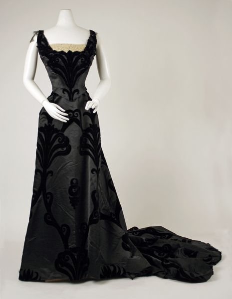 This evening dress, created by the House of Worth, encapsulates the opulence of high society fashion. The dress, likely worn by a woman of considerable social standing, is a powerful symbol of femininity, luxury, and the rigid class structures. House of Worth, founded in 1858 by Charles Frederick Worth, was a major influencer of Victorian and Edwardian fashion, designing elaborate and extravagant gowns for European royalty and the upper class. The dress’s design reinforces the era’s emphasis on the female form, while simultaneously restricting movement with corsetry. The choice of materials—velvet and intricate embellishments—speaks volumes about the wearer’s wealth and status. Each stitch, bead, and sequin tells a story of meticulous craftsmanship, privilege, and the performance of identity within elite circles. It invites us to reflect on how clothing can both empower and confine, shaping our understanding of gender, class, and beauty.