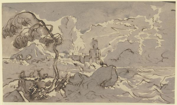 Antonio Basoli made this drawing, Mountain Torrents Flooding a City, using pen and brown ink with brown wash, which was a common technique for sketching architectural fantasies in the 18th and 19th centuries. The artist’s technique is well-suited to the subject: the brown wash, applied in broad strokes, evokes the chaotic rush of water. Pen lines define the city's structures – towers, walls, and bridges – but they seem fragile, overwhelmed by the deluge. Look closely, and you’ll see the artist has used hatching and cross-hatching to build up the tonal range, giving a sense of depth and drama. The materiality of ink on paper is crucial here. Unlike a painting, which can build up layers of color and texture, a drawing like this relies on the artist's control of line and tone to create an illusion of form and space. This piece showcases the expressive potential of a simple medium, elevating it beyond mere utility. It's a reminder that even the most basic materials can be used to create powerful and evocative images.