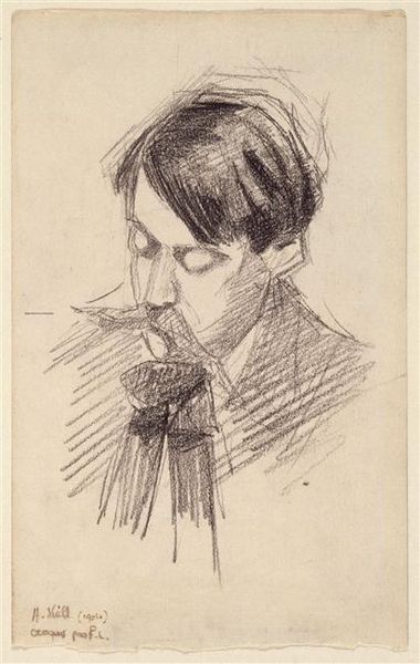 Curator: Gazing at us from 1912, this is "Self-portrait" by Samuel Jessurun de Mesquita, rendered in pencil. It resides here at the Rijksmuseum. Editor: Brooding! The eyes grab you immediately. Intense and perhaps a touch confrontational. It feels less like a mirror image and more like a declaration. Curator: Absolutely. Considering de Mesquita's tragic fate—he and his wife perished at Auschwitz—it's tempting to search for premonitions in those eyes. But maybe that's too simplistic. Editor: Tragedy undeniably colours our view, but let’s stick to the visual elements. The stark contrasts, the raw, almost unfinished quality of the lines... it amplifies that sense of immediacy. Did he normally work in this medium? Curator: Largely, yes. He taught graphic techniques, and was known for his woodcuts and lithographs, so the reliance on line and shadow carried across. Notice how the background almost dissolves, putting full focus on the face. Editor: And how! It's as if the very act of observing him forces him into existence. Semiotically speaking, his moustache could almost function as a barrier. Impenetrable, even. It draws my eyes in the negative space around the lines defining it. Curator: Perhaps a defense mechanism. Or a flourish of self-definition! His student, M.C. Escher, learned a great deal from him, though Escher's work took a vastly different direction. You see echoes of that commitment to graphic precision here, just stripped back. Raw emotion distilled. Editor: So, we’re left pondering what defines selfhood when reduced to essentials – the searching gaze, that striking moustache floating in space, and the ghost of the artist, lingering just beyond the frame of a deceptively simple piece. Food for thought. Curator: A glimpse, perhaps, into a soul about to face unimaginable horrors, rendered with startling, affecting vulnerability.