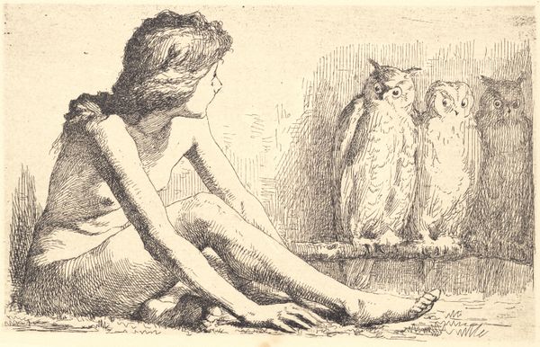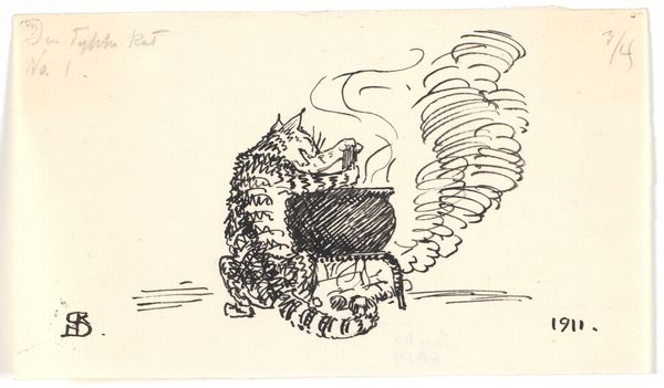 Curator: Today we're looking at "Kjetta Som Var Saa Fael Til Aa Ete", a drawing attributed to Theodor Severin Kittelsen, rendered in ink. Editor: Whew, that title! And what a wonderfully strange scene. The whole composition leans into an unsettling, fairy-tale mood—dark whimsy, perhaps? It has the quality of something remembered imperfectly, like an old tale someone told me when I was a kid, the way the details are at once super clear but kind of floaty and unanchored, too. Curator: That floating quality is precisely what interests me. Note how the lines, though precise, seem to delineate form more as suggestion than solid mass. Observe also the tonal contrast achieved solely through hatching and cross-hatching. Editor: True. Though I’m most riveted by the two figures. That enormous, smug cat practically oozes arrogance as it lounges amid scattered fishbones. The old woman…she is almost ghoulish. I love her scrawny neck, exaggerated features, and the almost comical, resigned way she's offering up that bowl. Is it kindness, a dark joke, or a threat? Curator: One might suggest the scene is pregnant with psychological tension. Note how the lines articulating the cat’s form are fuller, more confident than those defining the woman—visually, the cat dominates. Semiotically, one could say… Editor: Woah, pump the brakes. All those bones really put this scene over the edge, that dark touch turns what may have just been a simple scene of pet-and-owner relationship into a really grotesque little tableau. Curator: I think your term 'tableau' is a fair assessment of how the scene, although perhaps intended as a domestic matter, functions as a broader examination of themes relating to power, dependency, even repulsion. Editor: Well, regardless of Kittelsen's intent, for me, it evokes very complex, and unsettling emotions. It sticks with you, doesn’t it? Curator: Indeed. It's an efficient piece. Something in the juxtaposition between minimal, clear articulation, and inherent darkness proves quite striking.