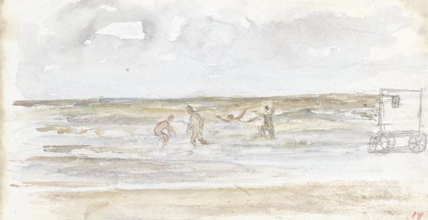 Editor: This is James McNeill Whistler’s “Grey Note - Mouth of the Thames,” created in 1885 using watercolor. It feels incredibly muted and calm, almost melancholic. The horizon line is so subtle, barely there, really. What strikes you when you look at this work? Curator: Funny you say that. When I look at it, I feel an almost ethereal quality, a sense of boundless space dissolving into atmosphere. I’m transported. It reminds me of the Thames’ role as a doorway to the world. The indistinct shapes suggest rather than define; ships are ghosts, water blends with sky, existence reduced to its simplest elements. Is it reality or just a fleeting dream? Editor: A dream! I like that. But why 'grey'? It’s not all grey. I notice the yellowish and brown tints, which make me think of industrial pollution, something ugly. Curator: It’s tempting to see the tones as a literal reflection of industrialization, and maybe there’s an element of that, but I think Whistler’s intention might have been different. Consider the "nocturnes"—he often used color to evoke a specific mood or musical quality. “Grey Note” suggests a subdued, harmonious resonance, more feeling than statement. Don’t you think? Editor: Hmmm, a muted harmony. Okay, I can appreciate that. It's almost as if the river and sky are whispering to each other, just out of earshot. Curator: Precisely! The “grey” then isn't just a color but a feeling, a quiet contemplation on the river's enduring presence, it's like looking into a mirror of your own memories. It’s a nice painting to daydream to. Editor: I see it differently now. Thank you for illuminating Whistler's choice of color. Curator: And thank you for helping me see it with new eyes, too. That is the beauty of it, isn't it?