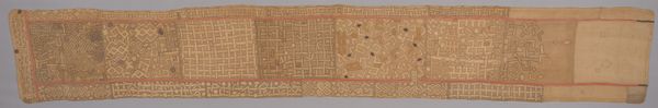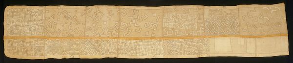 Editor: This is a Kuba textile panel from around the 20th century, housed at the Minneapolis Institute of Art. It’s incredibly detailed, and the geometric patterns create a mesmerizing visual texture. What strikes you most about its composition? Curator: The dominance of abstract geometric forms woven into the textile commands attention. Note how the interplay between figure and ground creates a dynamic surface. The variation in pattern density contributes significantly to the work's aesthetic quality, creating rhythms that pull the eye along the panel. How does this repetition affect your perception? Editor: It makes me think of codes, maybe even early forms of writing. Are the different shapes and lines trying to communicate something, or is it pure decoration? Curator: From a formalist perspective, we can appreciate this Kuba panel's design and composition, looking closely at how elements such as line, shape, and texture are manipulated to produce meaning. While specific symbol interpretation requires broader context, focusing on their relationships—the contrast of textures and scales of the pattern—reveals a sophisticated aesthetic system at play. Do you find a hierarchy in these patterns, or do they seem equally weighted? Editor: I see how some patterns feel more dominant due to their placement. Thank you for helping me focus on the purely visual elements; I was too quick to search for a hidden meaning. Curator: Focusing on purely formal components reveals a sophisticated language of visual structure. It shows us that art holds layers beyond mere symbolism or context, allowing deeper connections.
