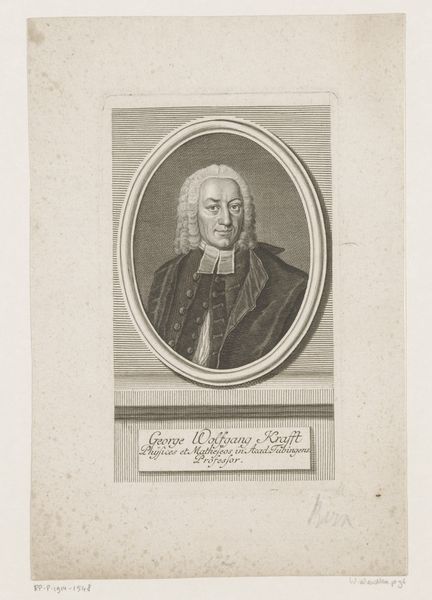 Johann Martin Bernigeroth created this portrait of Georg Conrad Rieger using etching techniques. The composition is structured around a play of geometric forms and textures. Notice how the oval frame softens the rigid lines of the background, drawing our attention to Rieger’s face. Bernigeroth's masterful use of hatching and cross-hatching not only defines the form and volume of Rieger's figure but also enriches the tactile quality of the print. This engraving exists as a sign, a representation of Rieger, but it is also an object in itself with its formal qualities and inherent structure. Bernigeroth’s work invites us to consider the semiotics of portraiture, exploring the way images function within systems of meaning and representation.