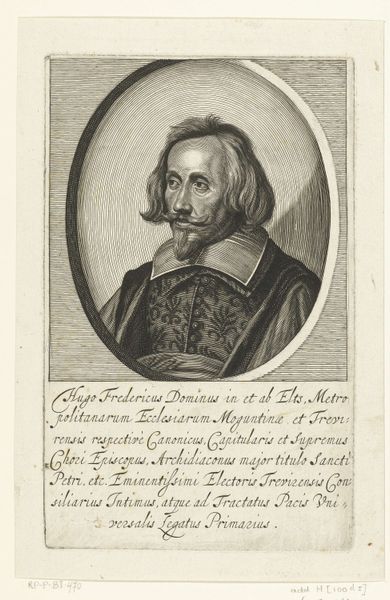 Editor: So this is Matthäus Merian's 1652 engraving, "Portret van Hugo Friederich von Eltz," housed here at the Rijksmuseum. The level of detail achieved purely through carving lines is pretty stunning. How did the material constraints of the engraving process affect the final image? Curator: Exactly. Look at the burin's labor—the intense physical effort to cut into that metal plate, line by painstaking line. How does that meticulousness reflect or even influence the portrayal of Hugo Friederich von Eltz himself? Was this controlled and repetitive production process mirroring or elevating the status of the subject, imbuing it with qualities beyond physical likeness? Editor: I see what you mean. The subject seems very contained and proper, even austere. Was the engraving medium commonly used to depict men of status at this time? Curator: It was. Engraving allowed for the wide dissemination of images, playing a vital role in constructing and reinforcing social hierarchies. Portraits like this one weren't simply about representation, they were about controlling the subject's image, embedding them in a network of power relationships sustained by materiality. Think about the access to, and costs of materials. Even who would be buying such engravings! How does that change how we understand the portrait? Editor: It shifts my understanding quite a bit. I was initially focused on aesthetics, but now I see how deeply interwoven this work is with the means of production and the dynamics of power. Curator: Precisely. It's not just about *what* is depicted, but *how* it's made and circulated, and who controlled those processes. The material reality of the engraving directly shapes its social function. Editor: That's a really powerful way to look at it; thinking about art as embedded within larger material and social networks. Curator: Agreed. Shifting the focus from subject to materials and production opens up valuable insights.
