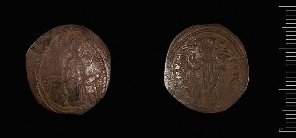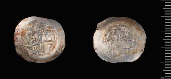 Curator: This is the Trachy Type D, a coin from the era of Theodore I of Nicaea. It’s a small piece, just over 4 grams, residing here at the Harvard Art Museums. Editor: There’s something quite haunting about it. The silver is worn, the images are faded, yet they remain. A past world persists. Curator: Exactly. Coins like these were not just currency. They were instruments of power, bearing potent religious and imperial symbolism. Notice the depiction of Christ on one side. Editor: And on the other, Theodore with Saint Theodore, reinforcing legitimacy. The cross between them is an obvious display of power structures, and an appeal to divine support. Curator: Indeed. It speaks volumes about the Byzantine era’s complex relationship between temporal rule and spiritual authority, a constant negotiation playing out in the visual language of the time. Editor: And still relevant today, when symbols are often exploited to rally political support or to consolidate power. It's useful to consider how those in charge present themselves to the masses. Curator: A reminder that the past is never truly gone; it circulates, reappears, and reshapes our present. Editor: It’s also a reminder that power is always a negotiation, a precarious balancing act.