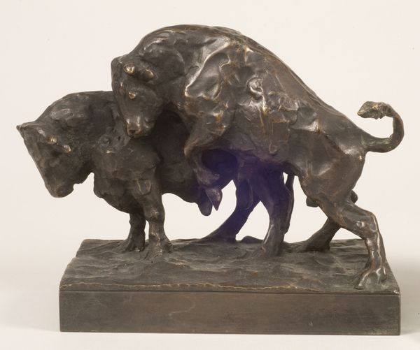Cast in bronze around 1896 by Edward Kemeys, this sculpture captures a brutal moment in the natural world. Kemeys was known for his animal sculptures, and here, the qualities of bronze itself - its density, its capacity to hold fine detail - intensify the drama. The lost wax casting process used would have begun with a wax model, carefully formed to capture the tension in the animals’ bodies. Molten bronze was then poured in, and once cooled, the mold was broken away, and the surface finished with chisels and patinas. Bronze, as a material, connects this sculpture to a long history of monumental art, yet Kemeys applies it to a distinctly modern subject, the raw struggle for survival. The sculpture’s realism reflects a scientific interest in accurately depicting animal anatomy, while its dramatic composition reveals the influence of Romanticism. Ultimately, Locked in Death invites us to consider how even the most refined artistic processes can be used to portray the harsh realities of life, and the ongoing contest between nature and culture.
