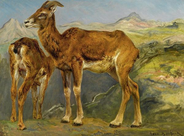 Editor: This is "Donkeys and Sheep in a Landscape" by William Huggins. It feels very pastoral, almost sentimental, with those fuzzy sheep. What do you see in this piece? Curator: Well, Huggins was known as the "animal painter," but it's interesting to consider how Victorian society projected its values onto these creatures. Do you notice the compositional hierarchy? Editor: Yes, the donkeys are prominent, almost idealized, while the sheep are more of a backdrop. Curator: Exactly! It reflects a romanticized view of rural life, masking the harsh realities of animal labor and agricultural economics. Think about the intended audience and how they might have interpreted this scene. Editor: So, it's not just about cute animals; it's about social messaging. I didn't think of that! Curator: Precisely. Art often serves purposes beyond mere representation.