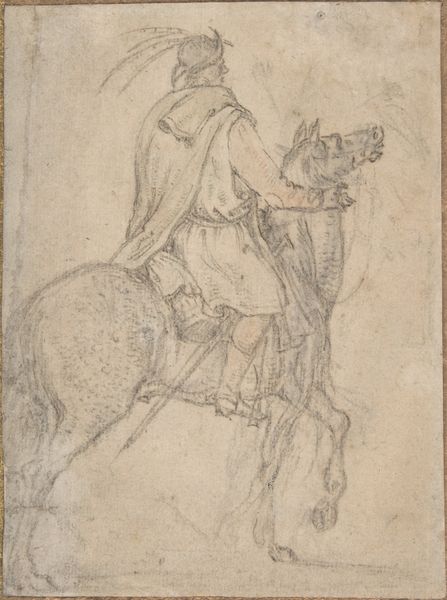 Hans Holbein the Elder created this drawing of Kaiser Maximilian I in travel dress on horseback, its date is unknown. The composition presents a figure on horseback, rendered in delicate lines and subtle shading that provides structure and depth to the composition. The horse and rider are positioned dynamically within the frame. Note the use of line to create the textures of the horse's mane and the folds of the rider's clothing. This attention to texture gives the figures a sense of liveliness. Semiotic analysis reveals the cultural codes embedded within the artwork. The figure, identified as Kaiser Maximilian, is depicted in travel dress, holding what looks like a lance; these details signify power, nobility and mobility. Overall, the artwork presents a complex interplay of formal elements that invite ongoing interpretation and re-interpretation.