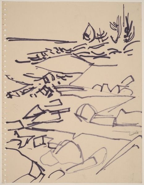 Curator: Wassily Kandinsky's "Kläge Pl.02," created in 1913 using ink on paper, offers a fascinating case study in abstraction. The stark black lines against the beige backdrop create an immediate graphic tension. What is your first take? Editor: It's certainly… energetic. Almost chaotic. There’s a visual jumble – an overwhelming sense of disjointed shapes floating without anchor. The materiality is simple, yet the effect is deliberately jarring. I see an unsettling tension in what could have been just simple ink and paper. Curator: I think understanding Kandinsky’s engagement with the "Der Blaue Reiter" group is crucial here. He was deeply invested in the spiritual in art, seeking to express inner emotions through pure abstraction. The production of this drawing, its seeming spontaneity, challenges established artistic conventions of the time. How does this departure get legitimized, what mechanisms come to bear? Editor: Agreed. Seeing this piece within that context helps. But consider also the role that galleries and collectors played. His turn to abstraction also shifted the kind of artistic labor being valued, and whom. Did this redefinition broaden or further restrict access and power within the art world? The institutional backing was pivotal to shaping the way viewers, then and now, interact with these images. Curator: Precisely. It wasn't simply about Kandinsky's individual expression but how institutions chose to present and interpret his process. The value we ascribe now wasn't inherent in the ink or paper itself but built up through historical narrative, critical analysis and subsequent market valuations. He broke with representational conventions to make these. Editor: And how the reproduction of the drawing itself democratized his vision, didn't it? The lithograph form, itself, enabled broader distribution, challenging the aura of the unique, original work, by making it more broadly accessible. Yet its market value has continued to soar, paradoxically. Curator: It’s a powerful paradox, revealing so much about the relationship between art, commerce, and ideology, wouldn't you say? A print designed to communicate, valued primarily now as high art, not as a social tool. Editor: Absolutely. The piece makes me consider the complex dance between artist intention, socio-political factors and the continuing impact that historical forces have in defining and shaping artistic creation. The conversation lives on.