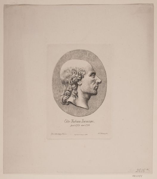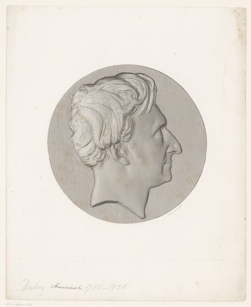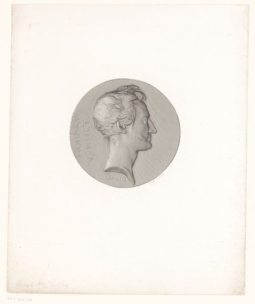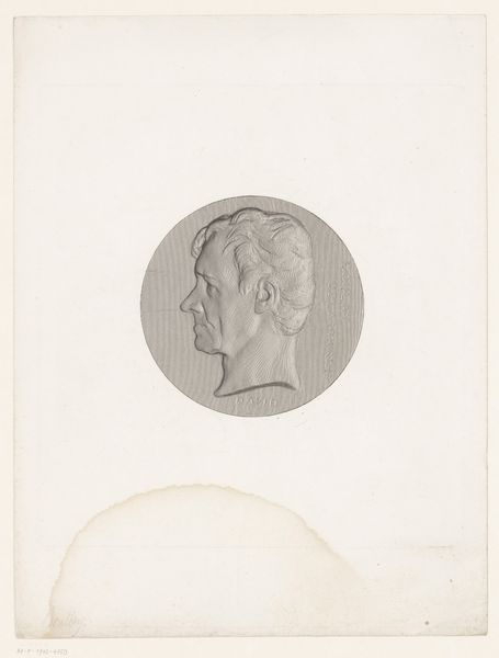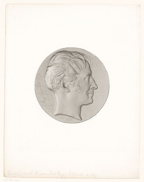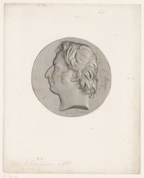 Editor: Here we have Achille Collas’ “Medaillon met portret van Barbra Allart,” an engraving from after 1834. It's quite striking in its simplicity; the profile is so clear and precise. What do you see in this piece, particularly in how it communicates something about the sitter? Curator: This engraving holds a fascinating echo of classical ideals. The medallion format itself harkens back to ancient Rome, where portraits served to immortalize individuals and project power or virtue. Notice how Allart's profile is rendered with a Neoclassical austerity – the clean lines, the emphasis on reason and order in her hairstyle. What emotions do you associate with this sense of order? Editor: Perhaps respectability or a certain reserved quality? It feels less about personal expression and more about conveying status. Curator: Precisely. Consider the symbolic weight of a profile portrait. Unlike a full-frontal view, which invites direct engagement, the profile presents a more detached, almost idealized image. What could this detachment signify within the context of 19th-century societal expectations for women? It wasn't necessarily cold; rather, the imagery emphasizes intellect and composure in the public sphere. Do you find her gaze inviting or distancing? Editor: It's distancing, definitely. Knowing this might have been intended to reflect status and intellect offers a richer perspective than I initially had. Curator: Indeed. By understanding the historical language of portraiture, we can see how even seemingly simple images carry a wealth of cultural meaning. These symbols endure over time. Editor: I agree. It makes you wonder about the sitter's own understanding of this symbolic language as well.