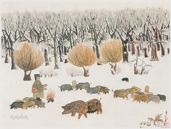 Editor: We’re looking at Ivan Generalic’s "The Deer Wedding" from 1959, a painting that presents a captivating, almost dreamlike, woodland scene. The contrast between the dark, dense trees and the almost luminous white deer immediately grabs my attention. It feels very much like a fairytale, slightly unsettling. What do you see in this piece? Curator: Ah, yes, Generalic. He always pulled you into his whimsical world, didn't he? For me, it's the tension, a push-and-pull between stark reality and this ethereal, almost haunting fantasy. Look at the bare trees against that brooding night sky, then these almost ghostly deer. It reminds me of old folk tales where animals carry hidden wisdom. What do you make of the title, “The Deer Wedding”? Does it conjure specific images for you? Editor: Well, "wedding" suggests union and celebration, but here it's...eerie? Maybe it's about the fragility of life and the strength of nature intertwined? Curator: Precisely! It makes me think about our own connections, human and animal. Perhaps he’s inviting us to be guests, even participants, in this sacred, silent ceremony. Almost like being drawn back to something ancient, primal… You know, he himself lived a rustic life; maybe this painting is his personal ceremony celebrating harmony? What do you feel you're taking away from this woodland gathering? Editor: It's making me rethink fairytales. It’s a far cry from the sanitized versions. More like stepping into the Brothers Grimm. It really showcases that sense of nature having its own world completely separate from us, with different customs and traditions, if you will. Curator: Wonderful insight. And you see how that makes it less about prettiness and more about a raw, almost vulnerable kind of beauty? Editor: Absolutely. It definitely shifts my perspective. It’s a beauty tinged with something a little wild. I feel like I have to read up on folk tales now, especially from Generalic’s part of the world. Thanks so much!