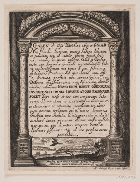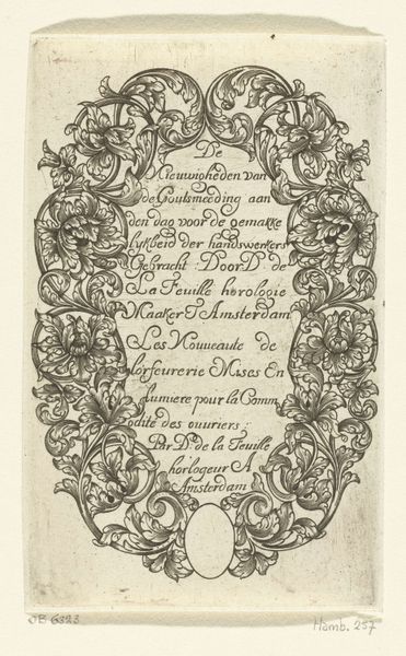 Editor: Here we have "Titelblad Liber maurusiarum duplicium (...)" created sometime between 1528 and 1580. It's an engraving, seemingly by Balthazar van den Bos, and part of the Rijksmuseum's collection. The ornamental borders and elaborate lettering give it a sense of meticulous craftsmanship. What symbols or ideas jump out at you? Curator: The immediate thing I notice is the border, it evokes the organic vitality emblematic of Northern Renaissance design. Do you notice the intertwining patterns, and the calligraphic elements? To me, it speaks to the era’s fascination with both the natural world and the rediscovery of classical learning, intertwined to reflect a humanistic worldview. Editor: Absolutely, it almost feels like the text is emerging from the foliage. So the image becomes a vessel, in a sense? Curator: Precisely. Consider how this title page functions—it’s an entry point, a symbolic threshold. What kind of information might have lived between the boards? Given that the text appears to reference "Moorish designs" and various crafts, one wonders how the historical perception of those symbols informed 16th-century artistry. Can you detect anything beyond surface aesthetics at play here? Editor: I see a focus on skill and artistry being emphasized. It seems geared towards a community of artisans? Curator: Yes! Perhaps to foster the spirit of innovation, dialogue, and learning among craftsmen. The image might reflect cultural exchange during the Renaissance, the blending of artistic traditions. Ultimately, the image resonates even now, suggesting our ongoing attempt to categorize and interpret the world around us. Editor: This was so interesting! Thank you for unveiling the symbolism to consider as it relates to artistry, identity, and innovation. Curator: My pleasure! The piece’s delicate artistry invites endless exploration.