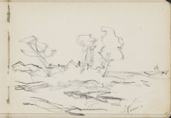 Editor: This is "Landskabsskitse med store tr\u00e6er," a landscape sketch of large trees by Theodor Philipsen, likely created sometime between 1840 and 1920. It’s a pencil drawing, very light and airy. What catches your eye about it? Curator: Well, first, let's consider the pencil itself. Philipsen's choice wasn't neutral. Pencils became readily available in the 19th century, changing how artists conceptualized drawing. It wasn’t about permanence, like ink might suggest, but about process and the ability to rapidly record observations. What does that tell you? Editor: It feels more immediate, more about capturing a fleeting moment. But how does that connect to materialism? Curator: Think about the labor involved, the extraction of graphite, the industrial production of the pencil itself. The rise of readily available materials shifted artistic focus. Landscape sketches became not just studies, but a democratic act of engaging with the land. Philipsen is using a tool born from industrialization to represent nature. Editor: So the very *thingness* of the pencil informs the art, not just what's depicted? Curator: Exactly. And consider the scale. This isn't a grand, commissioned piece for a wealthy patron. It's intimate, easily transported, suggestive of a personal connection to the landscape, perhaps intended as a commodity for a growing middle class with increased leisure time. Editor: That makes sense. I’d never really considered how the material itself could be so significant. Curator: Seeing the art objects as products with social implications offers a fresh lens. Consider how the accessibility of materials impacted the styles we see emerge, like Impressionism. Editor: That gives me a lot to think about when looking at art. Thanks!