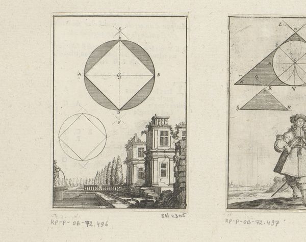 Curator: Sébastien Leclerc I created this print, “Op een gegeven hoek een rechte lijn oprichten”, around 1669. It’s an engraving, currently held in the Rijksmuseum. Editor: My goodness, what an enigmatic piece! It’s almost dreamlike, with these geometric forms hovering over a somewhat classical landscape and veiled figure. It sparks such a strange, quiet awe. Curator: I think what's interesting here is how it blends instruction with artistic representation. Notice the way Leclerc combines a geometric diagram, seemingly illustrating how to construct a right angle, with depictions of architecture and figures in a landscape setting. It really invites you to consider the interplay between abstract knowledge and practical application. Editor: Exactly! It's as if he is inviting us into the mind of someone like a master builder in that era; and this ghostly figure—is she contemplation itself, about to solve this geometrical puzzle by intuition rather than instruments? The lack of crisp definition really makes me ask, did he use cheap tools, or does the ambiguity of line reveal more than precision ever could? Curator: That's a wonderful way to put it. The very nature of engraving—its reliance on line and controlled mark-making— speaks to a kind of precision and intention. But the presence of landscape elements points us back towards the natural world and material practice where geometrical skills were vital in a wide range of creative jobs and building techniques. Leclerc challenges those sharp high art and low art boundaries by putting these together in this printed plate. Editor: Well, it’s successful. I could look at this engraving for hours and still come away with new reflections—thank you, Leclerc, for this puzzle! Curator: I agree; it’s an image that really sticks with you after seeing it.