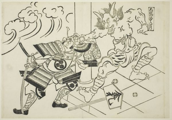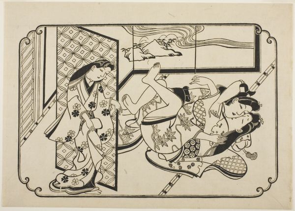 Okumura Masanobu made this woodblock print, Narihira: The Mirror Scene, using a process that was both graphic and sculptural. A design is carefully carved into the surface of a woodblock, leaving a raised image. Ink is then applied, and the image is transferred to paper. The resulting print has a distinctive character. The carved lines have a crisp, clear quality, defining the figures and the surrounding space. Note how the solid black ink creates bold contrasts, emphasizing the textures of the kimonos and the architectural details of the scene. This technique demanded precision and skill from the artist, who had to visualize the final image in reverse, and also, the printing process itself would have involved a division of labor. The series this print belongs to, depicts famous scenes from Japanese puppet plays, highlighting the popular entertainment of the time. Woodblock prints like this one were relatively affordable, so they reflect a burgeoning consumer culture in the 18th century. This artwork embodies a fascinating intersection of art, craft, and popular culture.