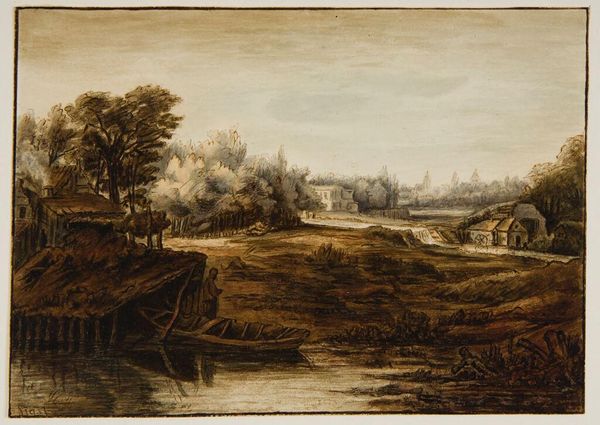 Curator: There's a certain wistful quality to this ink wash landscape. It is "Ruins beyond a Lake. Trees to Right, Plain Below," by Alexander Cozens. Editor: It feels melancholic to me, a study in decay. The sepia tones really emphasize a sense of time passing. Curator: Cozens was active in the 18th century, a time of great social upheaval, and ruins carried a potent symbolic weight. They spoke of the transience of power, of lost empires. Editor: And the way he places the ruins in the distance, almost swallowed by nature, is very telling. It diminishes their importance and amplifies the power of nature. Curator: Indeed. This play between the organic and the structural invites consideration. The large tree in the foreground seems to reclaim the landscape. Editor: It makes me wonder if Cozens was critiquing the societal obsession with grand monuments. The natural world endures, despite the ambitions of humankind. Curator: It's fascinating how a simple landscape can contain so many layers of historical and psychological meaning. Editor: Absolutely, I'll carry this image with me, thinking about the stories held within the landscape.