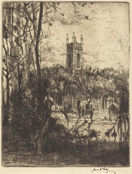 Curator: This print, titled "Damme," was created by David Young Cameron in 1907. What are your first impressions? Editor: Well, the atmosphere is instantly striking. It's got a rather brooding quality to it, wouldn’t you say? Almost gothic in its stark contrasts and composition with the skeletal trees framing the architecture. Curator: It’s important to consider Cameron's process. The etching technique, using acid to bite into the metal plate, would allow for a high degree of control in rendering those fine lines and tonal variations, giving it that somewhat stark look. The material limitations themselves would, in some ways, force the image into being. Editor: And think of the historical moment. Turn-of-the-century Europe, rapidly industrializing, while grappling with legacies of empire. Places like Damme were being impacted profoundly. You see it in how the looming church sort of dominates the scene – power, tradition… contrasting the daily life of villagers struggling in its shadow. Curator: I agree. It's important to see the connection to earlier traditions of printmaking as well as new developments in industrial technologies making images, like this one, so easily reproducible. Note the subtle shifts in light—how he uses that aquatint effect in the sky to create a velvety darkness behind the towering form of the building. A clear manipulation of the medium to convey depth. Editor: Exactly! The starkness speaks volumes. How systems of power, and religious institutions specifically, influenced and controlled social structures, often disproportionately affecting marginalized communities of the time. It acts as a commentary on uneven distributions of labor, opportunity and material wealth during this era. Curator: It gives us much to think about—Cameron's manipulation of material and technique resulted in a pretty powerful rendering. Editor: Yes, “Damme” isn't merely a landscape; it's a subtle critique of the forces at play shaping early 20th-century European society and power dynamics.