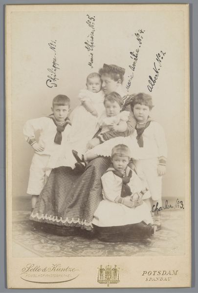 Curator: Here we have "Portret van een onbekende familie met vier kinderen, waarschijnlijk in Suriname", which translates to "Portrait of an Unknown Family with Four Children, Probably in Suriname". It's a gelatin-silver print, placing its creation somewhere between 1890 and 1910. Editor: Wow, that’s striking. The formality is so intense; you could cut diamonds on the edges of their expressions. There’s a world of untold stories locked in their eyes. Curator: Indeed. Note the arrangement of the figures: the parents in the center, anchors of the composition. The children flank them, creating a sense of symmetry, even as their individual poses break that rigid structure slightly. Semiotically, the father's military uniform signifies power and authority, contrasting with the mother’s somewhat subdued attire. Editor: And the backdrop! That painted curtain feels so staged, almost theatrical. Like they're aware of playing a role for the camera. Yet, there’s something poignant about that deliberate presentation. You can sense both the pride and the vulnerability in wanting to capture this family unit. The lighting too feels very… intentional. Curator: Precisely. The light source is clearly directed, enhancing the tonal contrasts. This adds depth and volume to the figures, sculpting their faces. The grayscale medium further accentuates the textures and the nuances of light and shadow. There's a dialectical tension here between the real and the represented. Editor: I'm thinking of the photographer. A fly on the wall almost, what secrets did he pick up? Suriname. How about his motivations, what’s his narrative perspective? Curator: Given the period and the colonial context, one must consider the potential power dynamics at play between the photographer and the subjects. Without further information, a definitive reading proves elusive, but it’s an essential factor in our analysis. The photographer also had his intention with lighting, it could potentially tell us what their status was in society, as well as the overall tone, given that it may portray serious events Editor: Well, whatever the power dynamics, the family’s spirit somehow shines through. There’s a timeless quality to this image, a testament to the enduring importance of family bonds. Thank you. Curator: An astute observation and indeed, I agree that while we can rigorously analyze its formal properties, at its core, this photograph serves as a powerful historical and human document.