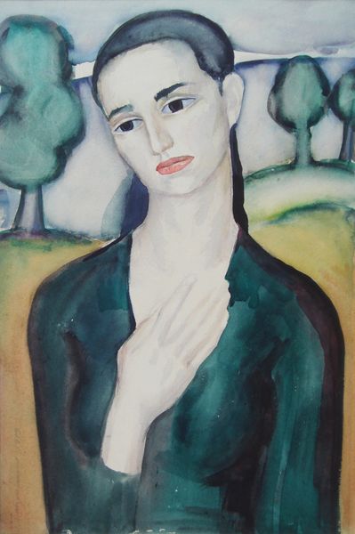Editor: This is Heinz Koppel's portrait of Helen Lessore. It's a striking, almost unsettling image. There's a fragility, but also a strength in her gaze. What do you see in this piece? Curator: I see a powerful statement about the gaze itself. Lessore was a gallery owner who championed marginalized artists. Koppel, a Jewish émigré, perhaps paints her with a knowing vulnerability, reflecting their shared experiences of displacement and the power dynamics within the art world. Do you notice how her hand gestures almost create a barrier? Editor: Yes, like she's both presenting and protecting herself. Curator: Exactly. This could be a commentary on the artist-patron relationship, her role in the male-dominated art world, and even her own identity as a woman of influence. What do you make of the leaves around her head? Editor: Almost like a laurel wreath, but faded, less triumphant. It really emphasizes the complexity, right? Curator: Precisely, challenging simplistic notions of power and success. Editor: I'll definitely think about that duality now. Thanks! Curator: My pleasure. It's about seeing the many layers of history and identity.