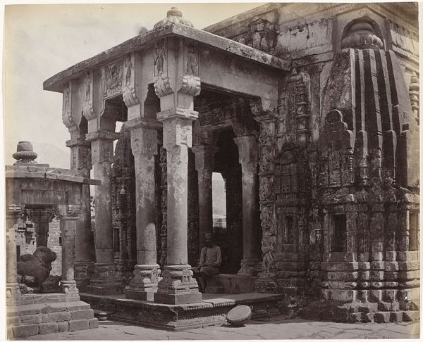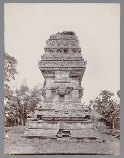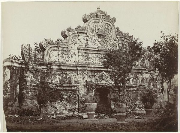 Editor: We're looking at a photograph by Isidore Kinsbergen, likely from 1867, titled "Kleine bijtempel met boven de ingang een Kala hoofd op Candi Panataran" - it translates to "Small side temple with a Kala head above the entrance at Candi Panataran." The print shows an ancient stone structure in a landscape. The stone details feel so intricate. How do you interpret this work within its historical context? Curator: It's fascinating to consider how this photograph functions both as a record and as a product of its time. Kinsbergen was documenting archaeological sites in Java, likely for colonial administration and European audiences. We need to ask, who was this imagery serving and how was it being used? The temple is presented almost as a relic, divorced from any active cultural practice. Does it make you consider the power dynamics inherent in such documentation? Editor: Absolutely. I hadn't thought about the colonial gaze so explicitly. I was drawn to the seemingly objective depiction of the architecture, but the context of its creation shapes everything. So this isn't just about preserving a temple visually? Curator: Precisely. It’s about defining a cultural narrative. This image circulated within specific social and political frameworks, influencing European understanding—and perhaps misunderstanding—of Javanese culture. Notice the framing, isolating the temple amidst what seems to be untamed nature. How does this affect the image’s narrative? Editor: It subtly suggests a contrast between "civilized" architecture and "untamed" nature, maybe implying a need for external influence, it creates this sense of 'otherness'. Curator: Precisely. Kinsbergen's photographs played a part in constructing a particular image of Java for the West. Understanding this shifts our perception, doesn't it? Editor: It definitely does. I’ll look at historical photography much differently now. Thank you for enriching my understanding! Curator: It was my pleasure. This has also clarified my views and sparked some questions for future inquiry!