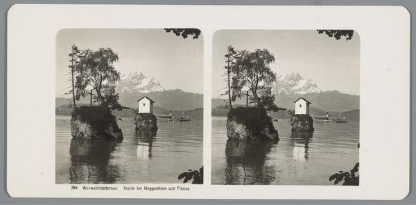 This small stereograph, titled 'Gezicht op Flüelen en de Bristenstock,' presents a monochromatic vista crafted by the Gebrüder Wehrli. Immediately, the composition draws the eye across a serene lake, framed by imposing mountains, with a quaint village nestled at their base. The dual image enhances the depth, inviting a deeper engagement with the scene's spatial arrangement. The photograph's formal structure evokes a sense of romantic idealism, typical of its time. The rigid composition, with its clear foreground, middle ground, and background, organizes space in a way that's reminiscent of classical landscape painting. The interplay between the sharp, snow-capped peaks and the soft, reflective waters introduces a play of textures, enriching the visual experience. This stereograph, beyond its aesthetic appeal, functions as a cultural artifact. It encapsulates the nineteenth-century fascination with picturesque landscapes, providing viewers with a mediated experience of nature, carefully composed and easily consumed. The monochromatic palette and the stereoscopic format underscore a tension between realism and artifice, challenging our perception of the natural world.