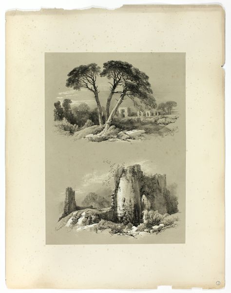 Curator: This lithograph, “At Dorking, from Picturesque Selections,” was created by James Duffield Harding around 1859 or 1860. It’s currently held right here at the Art Institute of Chicago. Editor: My first thought? It feels utterly, beautifully Victorian… that misty quality, a romantic haze over very real working life. You can almost smell the damp earth and hay. Curator: Absolutely. Harding was a master of imbuing landscapes with feeling. Look at the textural details he achieves with lithography; it almost mimics the grain of the wood in those rustic buildings. I see a subtle tension between romanticism and realism in the way it focuses on the scene, wouldn’t you say? Editor: I do, and it makes me wonder about the labor involved in creating and distributing prints like these. Each one would have required careful crafting of the lithographic stone, not to mention the physical demands of printing. Did Harding consider that a form of honest work that also defined romantic vision? Or how many hands helped with pulling each print off the press, I'd like to know the division of labor on one print, alone! Curator: That's a wonderful perspective. Harding would have likely seen printmaking as an extension of the landscape tradition. The idea of “Picturesque Selections” suggests a curated, idealized view. However, your idea draws attention to the means of reproduction and the layers of work it takes to build our realities. It forces us to consider who is missing, who's just outside the frame! Editor: Right. Those buildings aren’t just quaint structures; they're built, used, and likely owned. It pushes back, just a little, against the pure romanticism that erases any questions of labour from that era. I do think Harding also wanted us to consider it, somewhere along the line. I bet that this particular piece would have required a great deal of planning just to achieve a sense of artistic serendipity. Curator: I love how the composition directs the eye. Those figures near the bottom pull us in before drifting into the copse of trees. It makes the scale almost seem massive, even though it’s just on paper! Thank you for shedding your view and focus on how we should continue looking, not just at, artwork. Editor: Of course! We bring our history, experiences, knowledge about materials and context to whatever art speaks to us. And how we use what it has to say is how we really bring art to life.