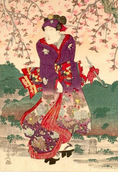 Editor: Here we have Keisai Eisen’s "No. 2 (Ni) from the series Popular Indigo Clothing (Ryuko ai shitate)," a woodblock print from around 1835. The indigo hues and delicate lines give it a very serene feeling. What strikes you about this work? Curator: I'm immediately drawn to the materiality and production of this ukiyo-e print. Consider the process: each color block carved and carefully aligned. And indigo, a dye deeply connected to trade and class in 19th-century Japan. Editor: That's fascinating. So, the indigo isn’t just an aesthetic choice? Curator: Absolutely not. "Popular Indigo Clothing"—it points to the burgeoning consumer culture. These prints weren't just art; they were commodities showcasing fashionable textiles, connecting art to the everyday lives and aspirations of the merchant class. Note how the pattern on her kimono suggests access to refined crafts and emerging production capabilities. Do you see how her garb places her in a particular class strata? Editor: Now that you mention it, the way her kimono drapes and the specific design does seem to suggest a level of affluence. How does the choice of woodblock print influence the art’s interpretation? Curator: Woodblock printing allowed for mass production and circulation. It’s an accessible art form, far removed from the elite painting traditions. Think of it as an early form of advertising or a fashion magazine, capturing the zeitgeist through reproducible imagery. Editor: I hadn't thought about it in terms of its social reach before. Curator: The materials and method are integral to its meaning. This piece captures not just a pretty face, but a moment in the evolution of Japanese material culture and the expanding marketplace of fashion. Editor: Thank you. It’s made me think differently about how materials and techniques directly connect to the subject matter itself.