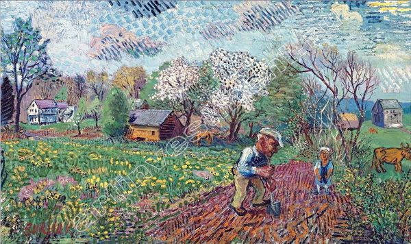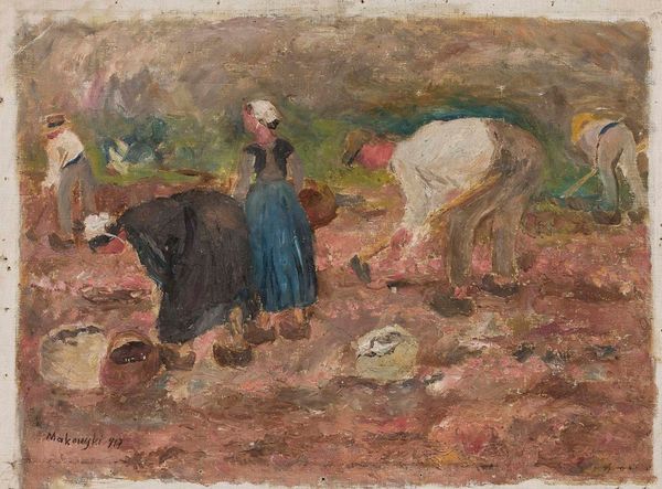 David Burliuk, a key figure in the Russian avant-garde, painted 'Woman with Red Cow' using oil on canvas. The thick, almost sculptural application of paint is immediately apparent, creating a textured surface that animates the entire composition. Burliuk's impasto technique isn't just about capturing light; it's integral to the work's social meaning. Look closely at the way he builds up the paint, especially in the cow's musculature and the woman's dress. This tactile quality emphasizes the labor involved, reminding us of the physical world and the work of those who inhabit it. The choice of subject matter – a peasant woman and her cow – further roots the painting in the realities of rural life, a theme that resonated with many early 20th-century artists interested in elevating the everyday. By drawing attention to both the materiality of paint and the lives of ordinary people, Burliuk blurs the lines between high art and the aesthetics of the working class, challenging traditional artistic hierarchies.