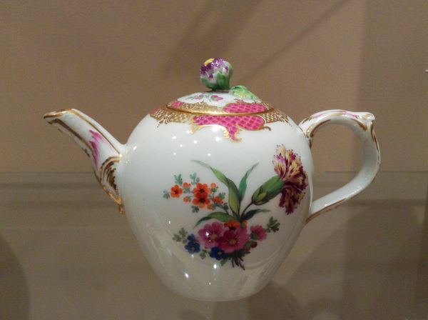 Editor: Here we have an ornate custard cup with cover and tray, created by the Royal Porcelain Manufactory between 1880 and 1890. It's made of ceramic and porcelain and resides at the Metropolitan Museum of Art. It feels almost excessively decorated, quite fussy. What cultural associations do you think a piece like this carries? Curator: Fussy is one way to put it! I’d say the decorations on this piece tap into a very specific yearning for refinement, an echo of the Rococo style, with its flowers and curvilinear designs. This isn't just about drinking custard; it's about projecting an image of cultivated taste. Note the flowers, commonly connected to ideas of spring, youth and rebirth, juxtaposed against the container which is there to receive custard, traditionally made for convalescence. Any ideas on why that is, or what meaning that has? Editor: It’s definitely not something I would have put together. Do you mean a visual symbol, that despite the associations with illness that porcelain pieces like these have, flowers imply vitality? Almost a symbolic cure in itself, a pick-me-up? Curator: Precisely! And consider the material, porcelain, a highly prized and delicate material, signifying status and fragility. All this fuss points to more than mere functionality. It presents cultural values associated with the elite – leisure, delicate beauty, almost performative fragility. Look at that handle: beautiful but probably hard to hold! This tension creates, in the user and the observer, certain psychological impressions. Editor: That's fascinating, it really adds depth to what I initially saw as mere fussiness. I appreciate that tension that gives the piece an almost tragic or ironic feel to it. Curator: Exactly! It reminds us that objects carry a lot more than just their practical purpose. They speak volumes about the values and aspirations of the cultures that produced them. A pick me up indeed.