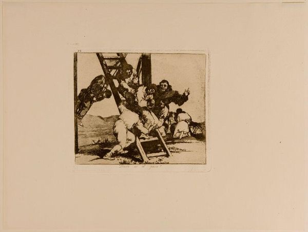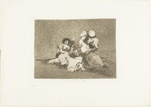 Editor: This is "The Women Give Courage" by Francisco José de Goya y Lucientes. It's powerful but somber. What kind of bravery is Goya trying to capture here? Curator: Note how Goya uses shadow and light. Consider, too, how women often embody societal memory. The woman holding the blade becomes a symbol—a re-emergence of ancient archetypes of female warriors, perhaps? Editor: So, you see her as more than just a figure in a scene, but as a symbol? Curator: Absolutely. Isn't courage, at its core, about reclaiming power, defying expectation? What happens when those roles are embodied by figures historically denied such agency? Editor: It's like Goya's tapping into something primal, twisting expectations about the feminine. Food for thought.