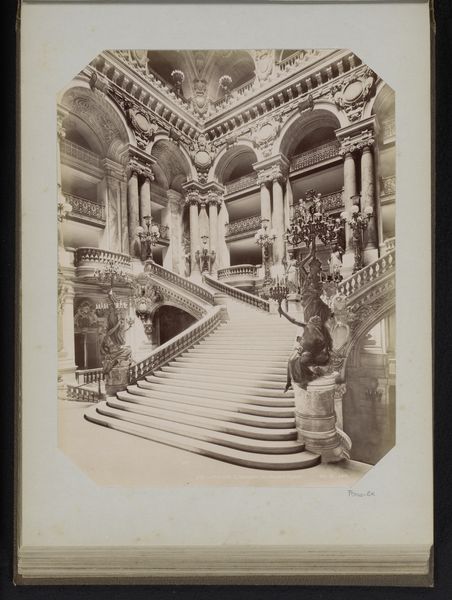 This photograph of a staircase, likely taken in Rome, was created by Gustave Eugène Chauffourier sometime between the mid-19th and early 20th centuries. During this time, photography was emerging as a powerful tool for documenting and representing the world, often reinforcing existing social hierarchies. Consider the perspective Chauffourier chooses: we are placed at the bottom of the stairs looking up. The architecture looms large, evoking a sense of grandeur and perhaps even inaccessibility. This viewpoint subtly mirrors the social dynamics of the era, where class divisions were pronounced and access to power and privilege was often restricted. The sepia tones lend the image a timeless quality, yet also subtly remind us of the historical distance. This invites reflection on how spaces and power structures persist, evolve, or perhaps become transformed. How do we navigate the architecture of power in our own lives?