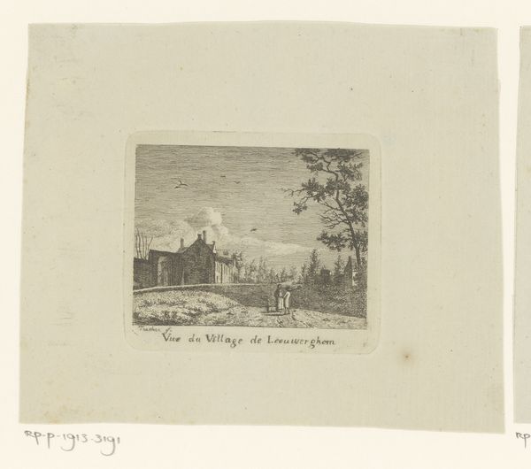 Curator: Hendrik Jozef Franciscus van der Poorten, between 1799 and 1874, etched this charming scene, "Landscape with Two People in a Rowing Boat Near a House," currently held here at the Rijksmuseum. Editor: Oh, it's a quiet sort of beauty, isn’t it? The way the dark, dense etching gives a kind of secretive, almost hushed feeling to the whole landscape. I immediately feel like I’m eavesdropping on a very private moment. Curator: It's a fantastic example of Dutch Golden Age etching. Look at the detail he achieves with line and the tonal range that he develops despite the image's size. You can clearly see influences from the broader romanticism movement too, focused on simple beauty and direct connection to nature. Editor: Exactly! The light feels… staged, almost theatrical. And yet there's a genuine stillness to the water and the house, like a stage set but also like a real place with years of life lived inside its walls. It's holding something back, inviting you closer to a gentle story that you'll never quite hear. Curator: And contextually, images like this were hugely popular amongst the rising middle classes. Print offered more democratized access to art. Rural idylls offered an escape from the grime and congestion of industrializing cities, appealing greatly to emerging bourgeoise sensitivities. Editor: Absolutely, an escape. Though, isn’t there also something about the medium itself? The etcher makes such an immediate physical mark—every line is a decision, like carving a memory directly into the plate. That sense of labor somehow lingers. Curator: Precisely. And its relatively small scale encourages an intimacy of viewing that paintings can often lack. You can imagine the print being circulated amongst a family or small gathering, becoming deeply entangled with shared stories and emotions. Editor: The figures in the boat—it's hard to say, are they on their way to somewhere, or coming back? I want to know who they are, even though it is really none of my business. Maybe I will write a little something. Curator: It’s amazing to consider the layers of historical reception the piece carries with it now too—each visitor brings a new perspective, a different lens. We can’t fully access a historical audience, but that imaginative gap can also be incredibly generative. Editor: Yes. Well, for me, it will sit and remind me about taking the long route, even if I have no place to be. Curator: And I'm thinking about the power of image dissemination in a pre-digital world. These small prints held surprising social significance in shaping the self-image of a nation.