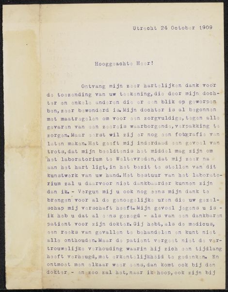This is a letter, made in 1906 by Cornelis Hofstede de Groot, and its marks are the pressed forms of typed words in ink on paper. In a way, every artwork begins with mark making, and here the artist is literally making his mark through a means of production. The letter is a window into the artist's process, his thoughts, and relationships. I wonder if the act of typing was frustrating or cathartic for him. The texture of the paper, the consistency of the ink, even the typeface all contribute to its feeling of history and intimacy. If you look closely you can see the smudges, corrections, and slight imperfections in the printing; these are traces of the artist's hand and mind at work. It makes you think about intention, accident, and the little things that make each work unique. The letter reminds me of the correspondence between Van Gogh and his brother Theo, in the sense that art is an ongoing conversation and exchange of ideas across time. It’s a reminder that art embraces ambiguity and multiple interpretations over fixed or definitive meanings.