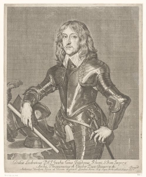 This is a portrait of Charles II, King of Spain, made by Jan van der Bruggen, using engraving. Engraving is a printmaking process where the artist meticulously carves lines into a metal plate, which are then filled with ink and printed. In this portrait, the technique brings a remarkable level of detail to the king's armor. Look closely, and you can see the expert use of lines and cross-hatching to create a sense of depth and texture. Engraving was crucial for disseminating images and information in the 17th century. It allowed for the reproduction of portraits like this one, making them accessible to a wider audience. Beyond the visual representation, this print speaks to the labor involved in its creation, as well as the broader economic systems that supported both the production of luxury goods like armor, and the making of images themselves. The choice of engraving as a medium underscores the value placed on craft and precision during this period, challenging our contemporary notions of what constitutes art.
