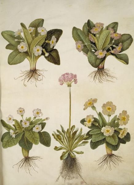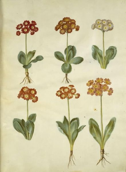 Editor: This is “Primula x pubescens (have-aurikel)” by Hans Simon Holtzbecker, made between 1649 and 1659. It’s a watercolor, gouache, and colored pencil drawing of six auricula plants. I’m immediately drawn to how precisely each plant is rendered. What aspects of its form stand out to you? Curator: The meticulous rendering of each specimen demands attention. Observe the varied corollas: from the arrangement of the petals to their individual coloration. Note the subtle differences between the six plants. Holtzbecker hasn’t created identical copies; instead, each is a study in botanical specificity. What compositional elements hold these individual studies together? Editor: I guess the placement... They're evenly spaced. Each plant takes up its own space on the page but they work together as a collection? Curator: Precisely. The formal arrangement allows for a systematic comparison. Notice how the artist uses a pale ground, achieving both tonal and textural contrast. Are you perceiving any dynamic tension in the relationships between individual flowers and groups of plants? Editor: The lower right flower looks different because of its angle - a sense of looking from the side versus directly head on. Also the difference in the stem and root lengths contributes a sense of unique shape. It feels a bit more casual or dynamic. Curator: Yes, I see how those intentional variations invite closer examination, demonstrating that, even within seemingly rigid structures, dynamic subtleties and the unique expression of form emerge, enriching our understanding. Editor: I never considered art could exist to systematically record the differences between the plants like this... but I am fascinated! Thanks for shedding light on this interesting watercolor! Curator: My pleasure. It has offered a further insight into form, inviting a broader reflection on natural variations, reminding us that structure allows us to observe those variances.