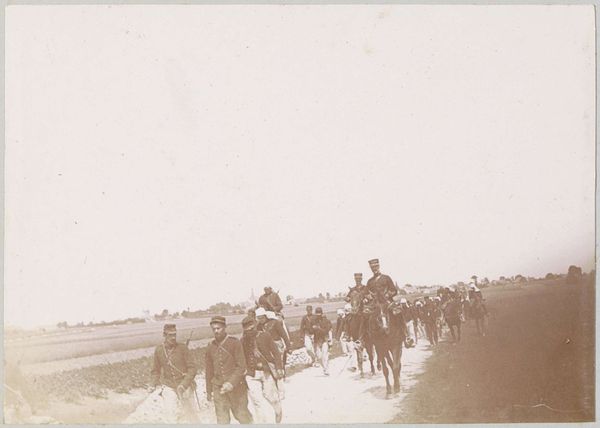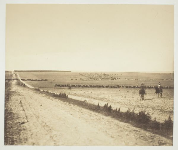 Gustave Le Gray captured this unnamed image using photography in the mid-19th century. The photograph's composition directs your gaze across a vast, flat expanse towards a distant assembly of figures and artillery. Le Gray masterfully manipulates tonal values. The foreground is softly textured, leading to a horizon where the military elements are sharply defined. The sky, an almost bleached white, contrasts with the earth's subtle gradations. This contrast doesn't just illustrate a scene; it imposes a visual order, structuring the image around themes of space and perspective. Consider the semiotic implications of this structured space. The military display could be read as a symbol of power, but the muted tones and the isolating expanse challenge any triumphal reading. Instead, the photograph offers a meditation on distance, both physical and symbolic, inviting us to question the grand narratives of the time.