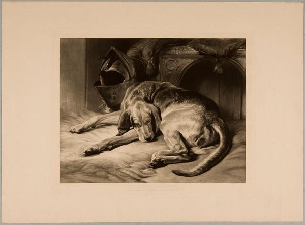 Curator: This is Jean Daullé's "The Dog Braque with all her Family." Look at how the artist uses line. Editor: It evokes a sense of warmth and domesticity, the textures of fur and straw are so palpable. What materials did he use? Curator: Daullé, who lived from 1703 to 1763, rendered this image with engraving. Notice the linear precision, particularly in the dog’s fur and the adjacent basket. Editor: The engraving perfectly conveys the relationship between mother and pups. It also highlights the relationship between the labor of making the print and portraying the family's rest. Curator: Yes, the contrast between the sharp lines of the engraving and the soft forms within creates a striking visual tension. Consider also the use of dark and light to give the scene depth. Editor: It really makes you think about the conditions needed for nurturing new life, even if the setting is a modest barn, captured through the work of a master engraver. Curator: Absolutely, it's a piece that invites prolonged observation and contemplation. Editor: I agree. It is a testament to the enduring appeal of depicting the material realities of animal motherhood.