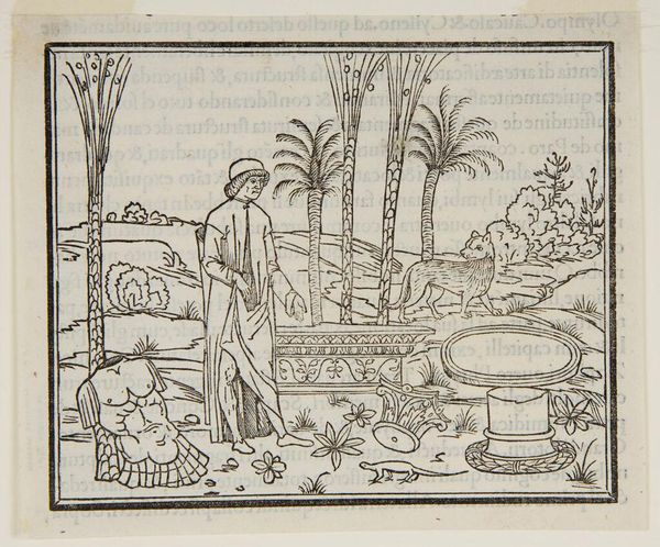 Editor: So, here we have an anonymous engraving, "Poliphilus looking through the bower while his mistress Polia is approaching at a distance." It feels almost like a stage set, doesn't it? What do you make of it? Curator: It does have a theatrical air! I find myself drawn to the contrast between the solid architectural forms and the wild, untamed nature creeping in. It's as if the rational world and the passions are locked in an eternal dance. Do you sense that tension as well? Editor: Absolutely. The garden feels very…constructed, but the foliage is so unruly! I never thought of it that way. Thanks! Curator: My pleasure! It’s a constant reminder that art, much like life, is about finding harmony within chaos.