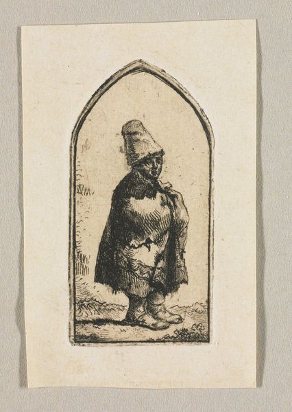 Charles Jacque made this etching, "Beggar with hat and walking stick," using metal plates, acid, and ink. Look closely, and you can see how the etching process allows for incredibly fine lines, capturing the texture of the beggar's worn clothes and weathered face. The artist would have painstakingly drawn the image into a wax coating on the plate, then dipped it in acid to bite away the exposed metal. The depth of the lines dictated how much ink they’d hold. The final print then depended on the amount of pressure applied during printing, in turn influencing the tonal range and visual impact. The print is small but powerful, and reminds us of the labor involved not only in its making, but also in the life of the man it portrays. Jacque prompts us to consider the social conditions that create such stark disparities in wealth and opportunity. The image is a reminder that art can be a powerful tool for social commentary, bridging the gap between the studio and the world around us.