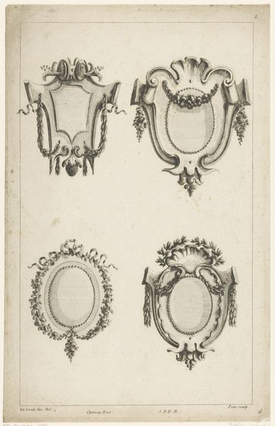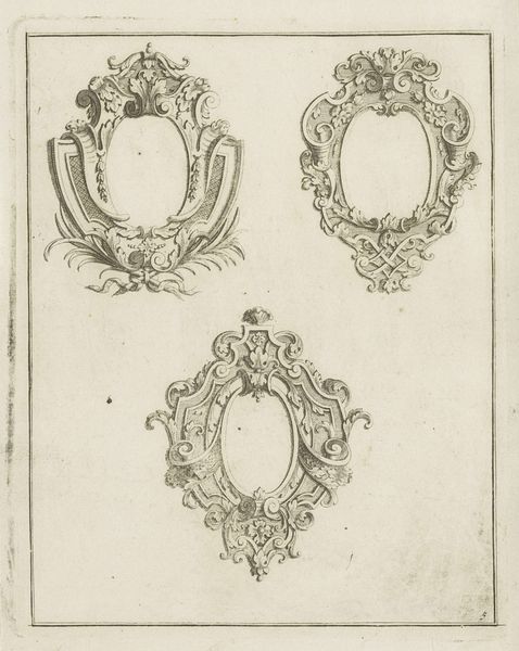 Editor: This work, titled "Twee ovale omlijstingen," created in 1768 by P.J. Bertren, presents two oval frames rendered in engraving. They feel delicate, almost like a blueprint for aristocratic décor. What do you make of it? Curator: The labor of engraving, here, is paramount. Look at the meticulous tooling – the repeated action required to transfer these designs to paper. We often divorce "high art" from craft, but the engraver's skill, the production of these objects, highlights their inherent value as material culture, part of consumption. How do you think these would be used? Editor: Perhaps as designs for mirrors or portraits? Were these accessible to everyone, or mainly a luxury item? Curator: Exactly! Their purpose likely extended to luxury goods. Think about the social context. The Rococo style signified wealth and taste, an association heavily reliant on specialized craftsmanship. Consider the source of the materials – the paper itself, the metal of the engraving tools. These materials and processes directly reflect 18th-century production and trade networks. Does it change how you see it? Editor: Absolutely. Thinking about the access to materials and level of artisanal skills makes me consider its position as more than just decorative art, but as evidence of labor and commerce. Curator: Precisely! By centering on its means of production, we begin to understand the art not as solely aesthetic, but a product deeply embedded in a specific material reality. Editor: I'll definitely look at decorative art differently now! Thank you.