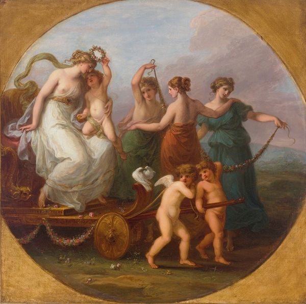 Angelica Kauffmann created this painting, 'Diana and her nymphs bathing', with oils on canvas. The circular format immediately establishes a sense of enclosure, framing the figures within a classical idyll. Kauffmann uses soft, diffused light and pastel colours to create a serene and sensual atmosphere. Notice how the composition is carefully arranged to guide the viewer's eye. The figures are grouped in a way that creates a balanced and harmonious whole, typical of Neoclassical aesthetics which prioritizes order and clarity. The flowing lines of the drapery and the gentle curves of the bodies contribute to the overall sense of grace and elegance. The painting engages with ideas around femininity and classical mythology. It invites contemplation on themes of purity, beauty, and the natural world. These are presented not as fixed categories, but as fluid and interconnected concepts. The artwork serves as a site for ongoing interpretation. Its formal qualities allow for an understanding of cultural and philosophical discourses of the time.