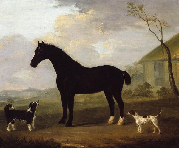 Curator: Alright, let's talk about "Two Horses in a Meadow near a Gate," crafted in 1649 by Paulus Potter. Editor: Immediately, there's something deeply pastoral here, almost meditative. The contrast between the dark and white horses strikes me too. Is it just me, or is there something slightly melancholic in that misty horizon? Curator: Well, the formal composition indeed creates a sense of serenity. Observe how Potter masterfully employs realism; the texture of their coats rendered in striking detail, the atmospheric perspective softening the distant cityscape. It’s all meticulously constructed to evoke tranquility. Editor: Meticulously, yes, but with a wink, perhaps? The horse looking directly at us over the gate seems so incredibly…knowing. Potter wasn't just painting animals, was he? It’s more than just realism; it almost borders on the allegorical, don’t you think? A statement on freedom or captivity maybe? Or maybe I’m just projecting! Curator: A projection based in good faith. Remember the Dutch Golden Age. Landscape painting elevated but still imbued with national pride. Horses, symbols of status. Land ownership on display in art of remarkable detail and symbolism. Editor: Okay, alright, so status symbols prancing around a misty meadow. That makes sense. But does status always have to look this… pensive? I keep coming back to it, it feels as if something more profound is hinted at; an undercurrent, a murmur of something ineffable. Look at how light caresses that darker horse! The animal almost blends in with the gate, framing the entire background composition, as though the subject were a fleeting scene of nostalgia. Curator: A fair reading, considering his choices. Ultimately, this painting becomes more than simply art of barnyard bliss. What we perceive becomes integral to its layered interpretations. Editor: Exactly! These oil paints and canvases from the 17th century become conduits to understanding a world back then, or what we wanted the world to look like back then… Thanks for shedding more light on that; what initially struck me was maybe melancholy can be seen, now, more as perspective, when observed with an educated view.