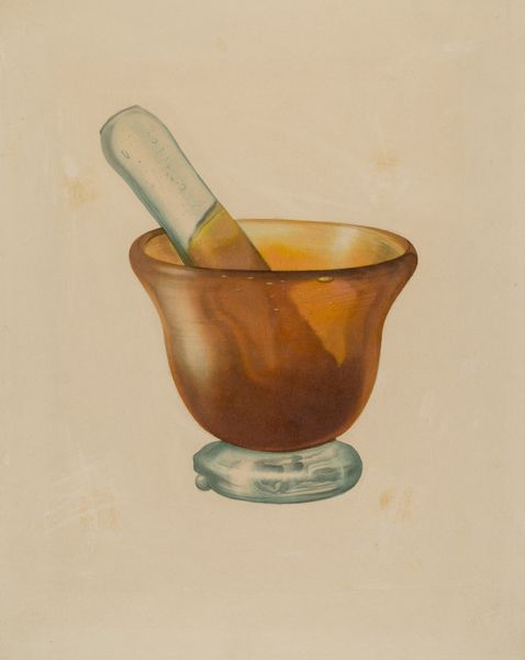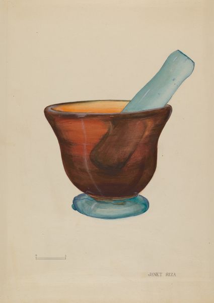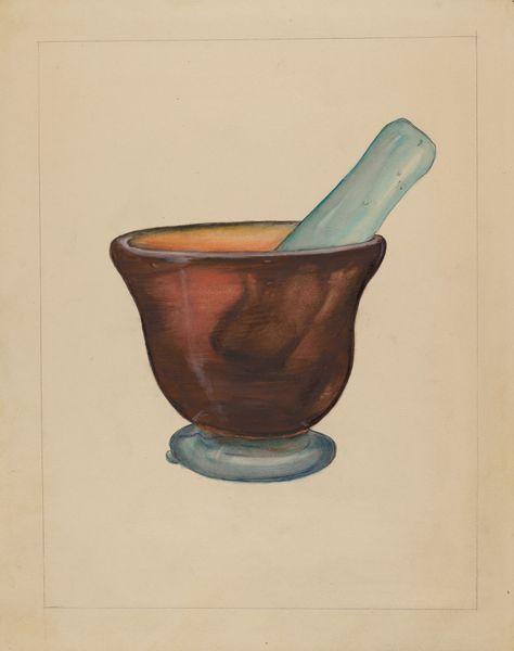 Curator: We’re looking at Ralph Atkinson’s watercolor drawing, "Cake Mold," created in 1937. Editor: Right off the bat, it's warm, almost sepia-toned. Makes me think of grandma’s kitchen. Something solid and reliable. Curator: Absolutely. In the 1930s, the domestic sphere became highly politicized. So, it could be seen as a deliberate emphasis on traditionally feminine roles, especially during the economic hardships of the Great Depression. Editor: Hmmm, you’re probably right. But I feel this artist relishes textures—look how he renders the dark, almost burned edges, the metallic shine inside. It’s strangely… beautiful, I would even say. I am always fascinated how artist draw from very uninteresting object and turn it into fine art. Curator: His style aligns with Realism, so there's an intent to depict everyday objects accurately. It might also be a reflection on the accessibility of art. Bringing value to simple tools and highlighting craftsmanship accessible to everyday people Editor: Crafts are totally important. In an age when everything is made and automated by a computer. And not just functional… think of the nostalgia baked into this pan! All of our personal memory tied up to grandma and cake… Layers of memories... Just like the layers of a yummy cake. Curator: Right! But let’s go a step deeper. We could analyze how this domestic still life implicitly addresses societal expectations around labor, gender, and consumer culture. Was baking truly an expression of freedom for women, or was it another form of unpaid, unrecognized labor? Editor: Whoa, wait up! Can’t we appreciate the picture and delicious treat on its own merits, without overthinking it to pieces? It reminds me of when my mother taught me to make bundt cake; my only concern was devouring the masterpiece! Curator: Sure, art can offer individual joy, but art is rarely apolitical, is it? Atkinson’s “Cake Mold” can provoke reflection about labor, nostalgia, domestic life. And by raising questions about historical expectations, we invite dialogues for change in contemporary practices. Editor: Ah, I see. So it’s more than just about dessert; it's about reflecting and potentially re-writing recipes of old times. Curator: Precisely!